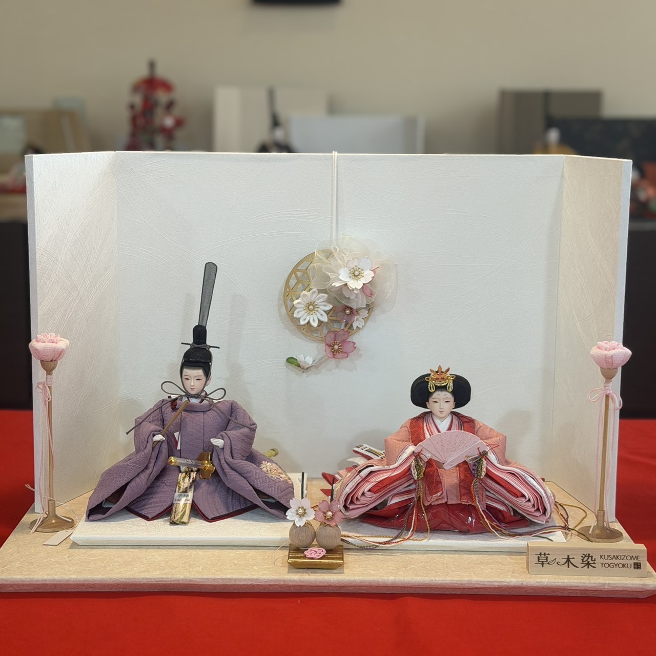 【雛人形】みうか-草木染【サイズ】間口50㎝×奥行30㎝×高さ32㎝【ポイント】*衣裳は草木染で袖には可愛らしい刺繍のお花と毬の柄が施してあります。草木染の優しい色合いが映えるよう屏風は白にしました!吊下げるタイプの飾りがまた華やかなに華やかにしてくれます。【税込価格】164,420円
