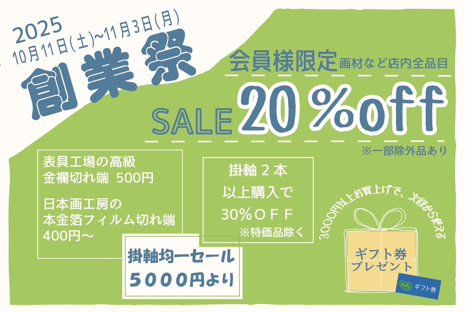 2025年10月11日(土)〜11月3日(月)の期間、美術の森では大創業祭をおこないます。美術の森会員の皆さまにお得な催しが満載ですので、是非ともご来店ください!!