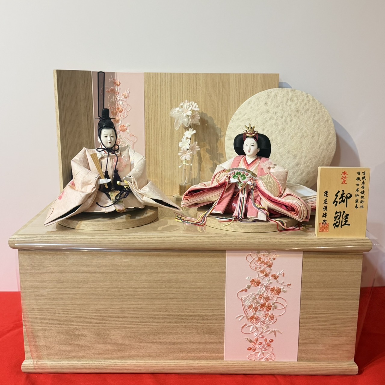 【ひな人形】和奏‐桜染め‐蓬左佳峰【サイズ】間口60cm×奥行33cm×高さ53cm【ポイント】*衣裳は優しい色合いの桜染め。衣裳に合わせて刺繍も地色がピンクで濃い色合いで刺繍が施された収納箱とあわせました。丸い和紙はライトがつく仕様です。和紙の温かみのある光に当たるひな人形もより一層輝きます。【税込価格】191,400円