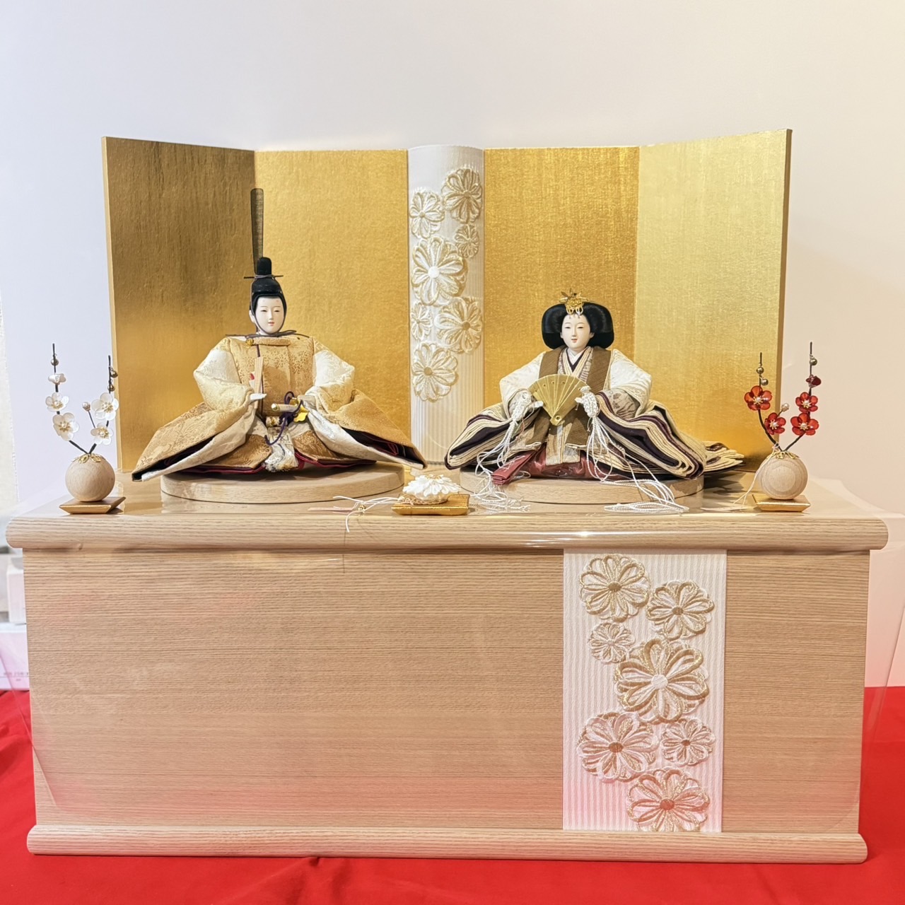 【ひな人形】希華-草木染【サイズ】間口70㎝×奥行38㎝×高さ62㎝【ポイント】*お内裏様は色鮮やかな琥珀色の草木染。お雛様には着物の地模様を生かしたシックな草木染。屏風の刺繍部分はライトがつく仕様となっております。中央のお飾りの花は扇としてもお使いいただけます!【税込価格】218,400円
